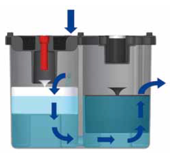 Los separadores EcoWater, con una configuración de varias etapas de dos torres, está constituido por un elemento de fibra de polipropileno y un elemento de carbón activo, especialmente seleccionado y tratado para maximizar las propiedades de adsorción, lo que permite la máxima eficiencia de filtración.